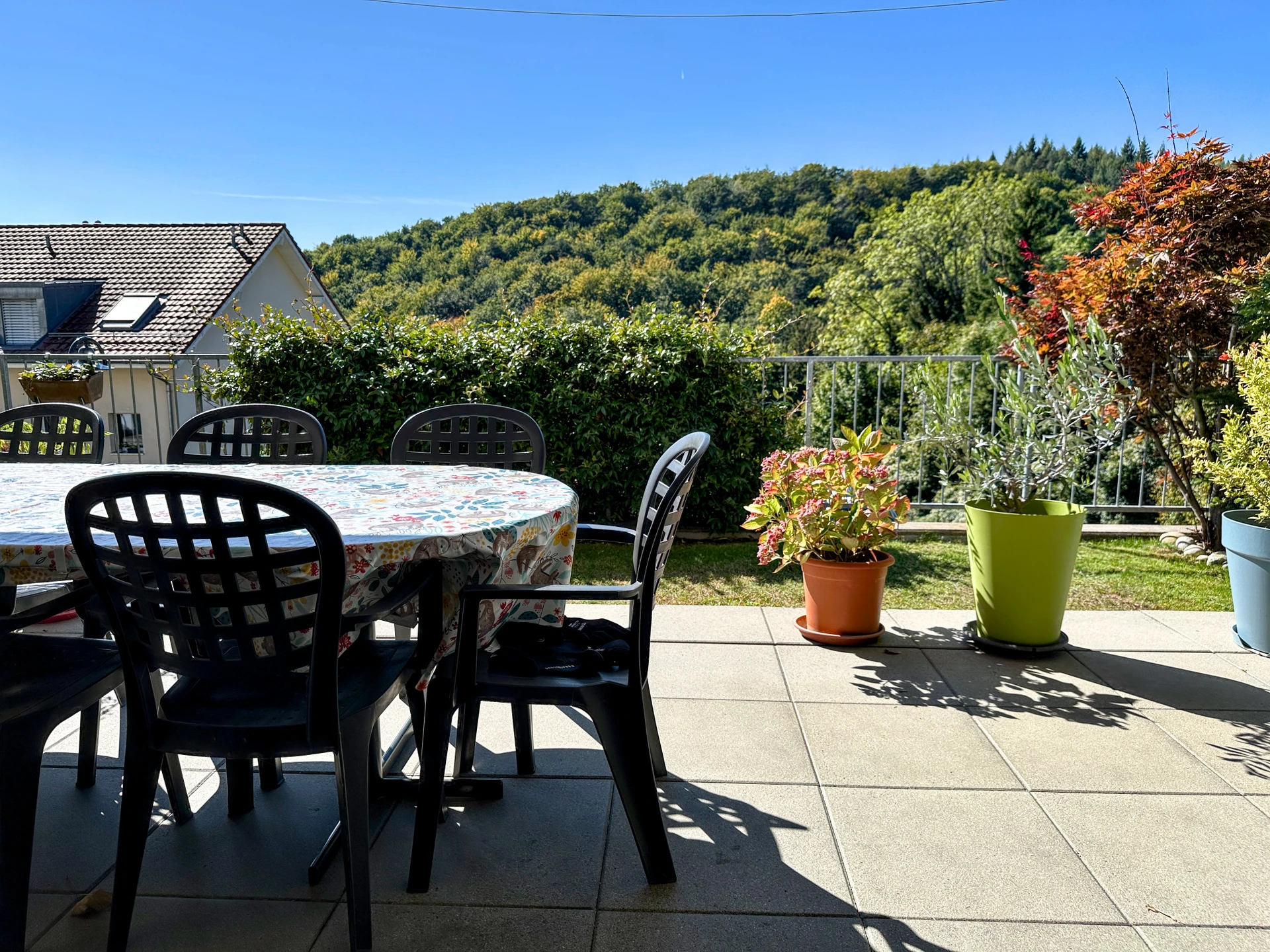 • Superbe terrasse en L faisant le tour de l’appartement, offrant un espace extérieur unique avec vue sur la forêt et les champs