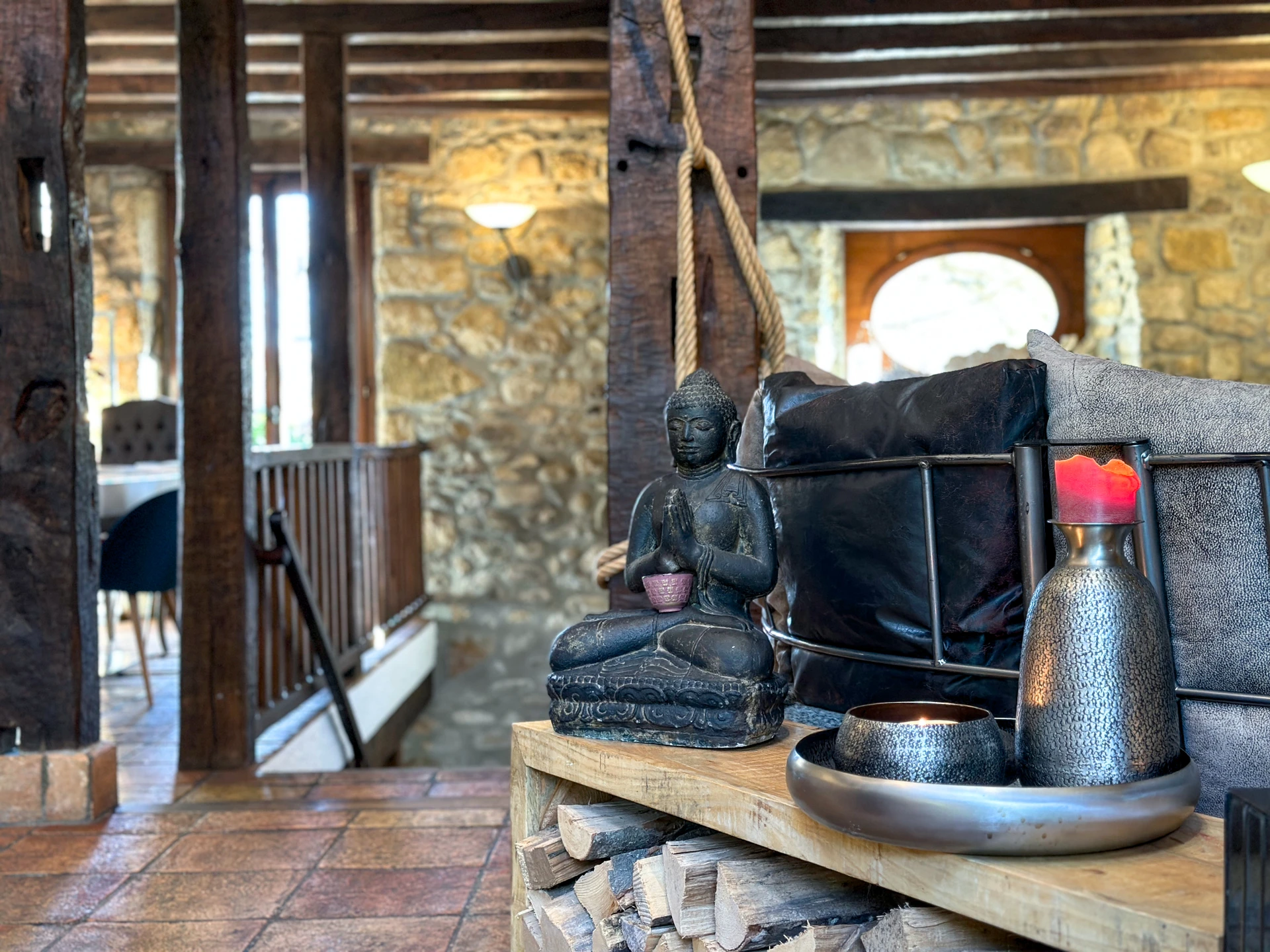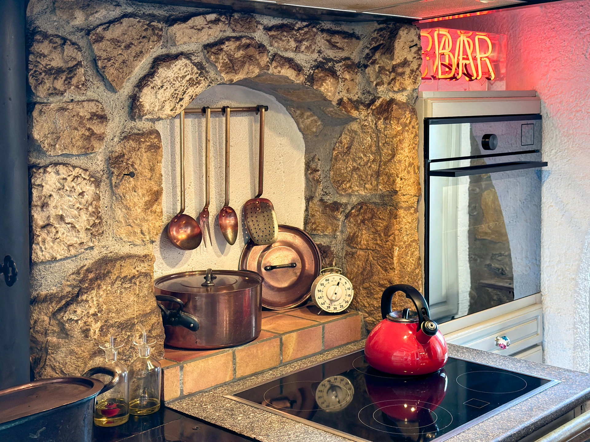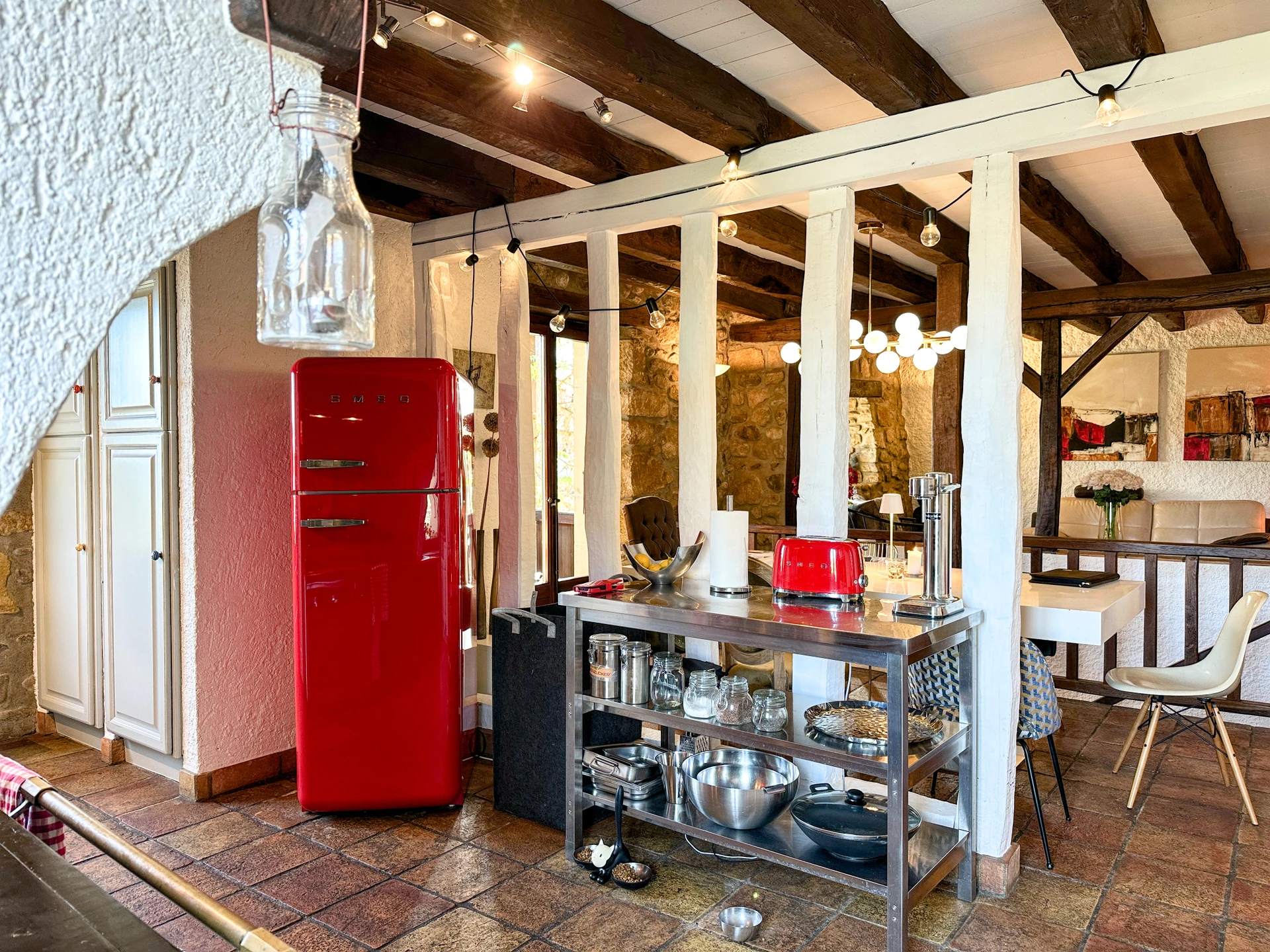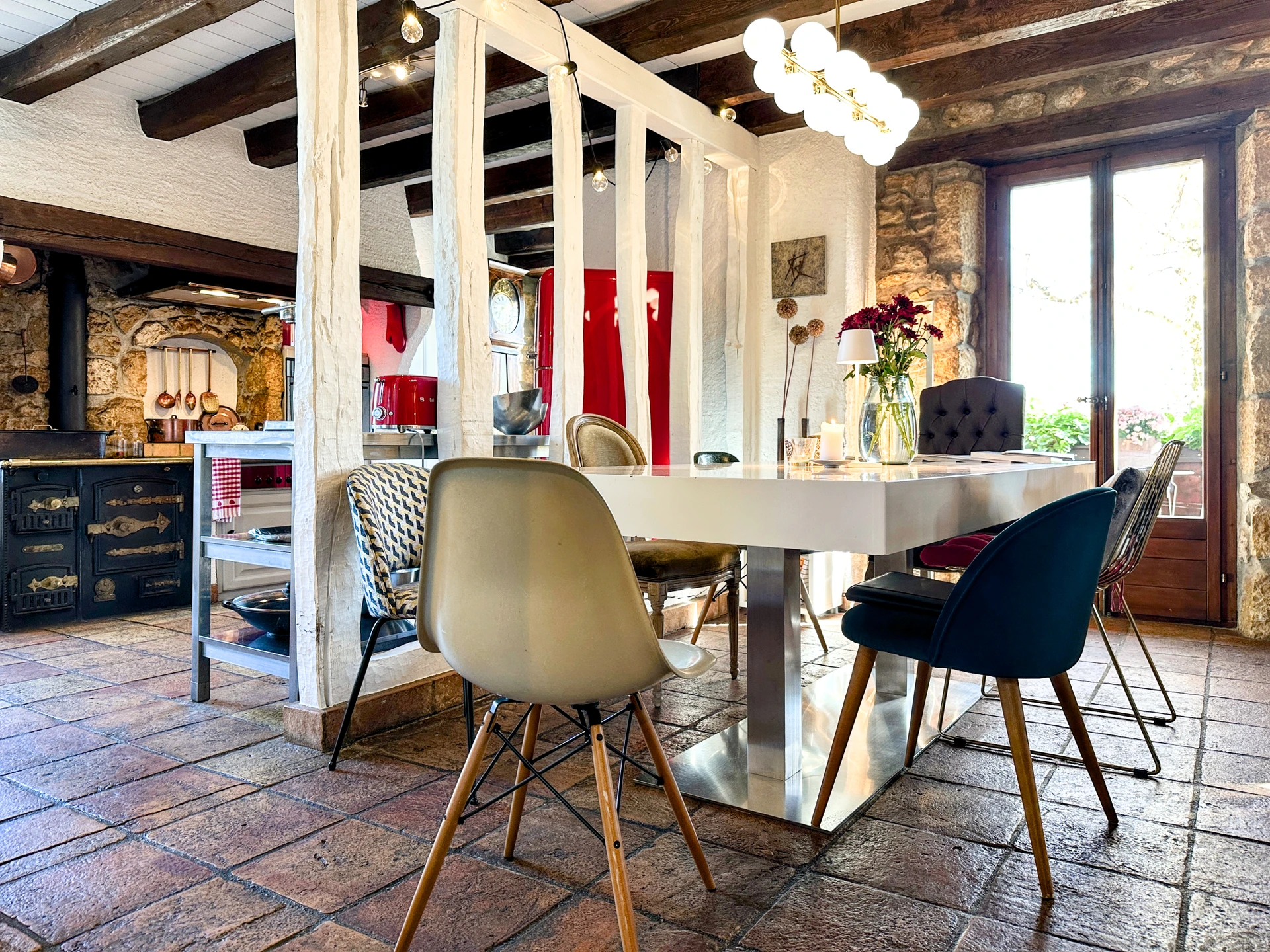Dès l’entrée, la magie opère : pierres apparentes, poutres d’époque, volumes spectaculaires et une cheminée monumentale digne d’un château. La pièce de vie principale, baignée de lumière, offre un open-space impressionnant avec cuisine équipée d’un piano à bois, évier en pierre, et coin repas convivial.