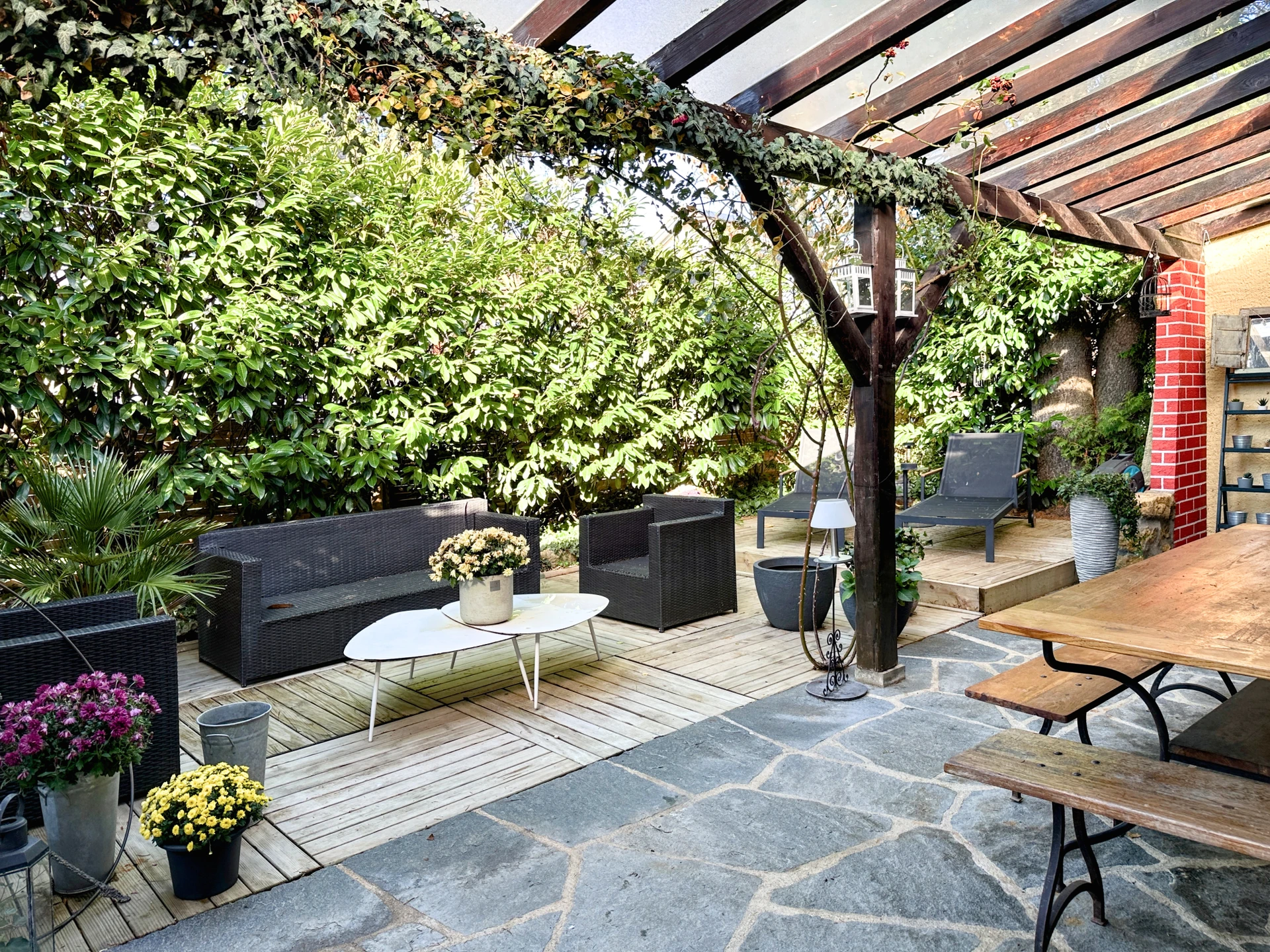 Les extérieurs sont à l’image de la maison : terrasse ombragée sous les arbres, cour d’entrée élégante, garage, place de parc et sous-sol avec cave à vin. L’ensemble respire la sérénité et la beauté intemporelle.